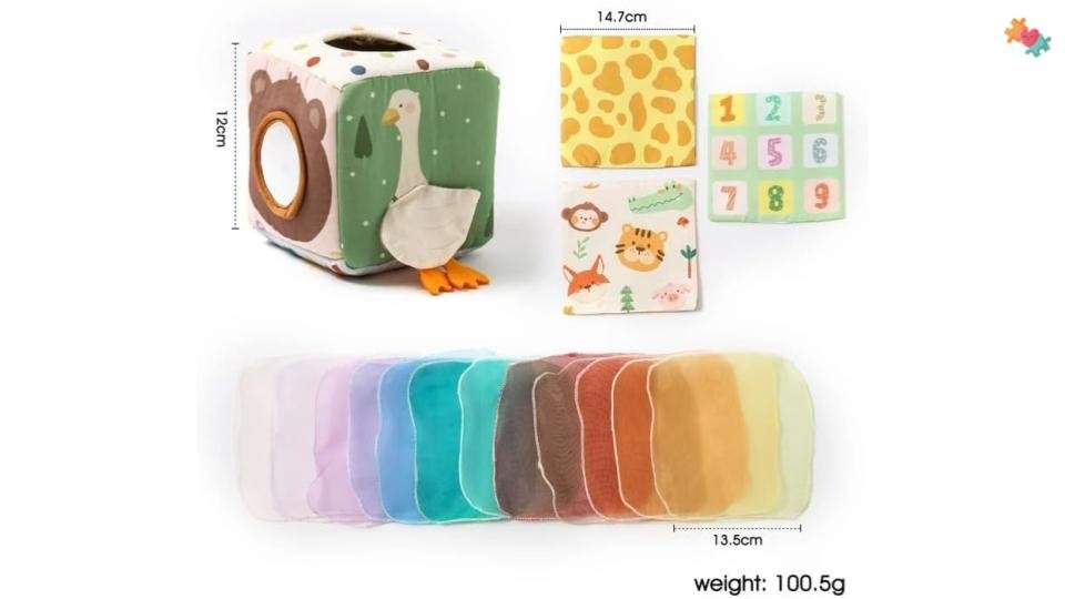 Com design colorido e divertido, o cubo apresenta padrões de animais e diferentes texturas em cada face, incentivando a curiosidade e o desenvolvimento cognitivo. Um dos destaques é a função de caixa de lenços coloridos, que permite à criança puxar tecidos de dentro do cubo atividade que estimula os movimentos das mãos e dedos de forma prazerosa.